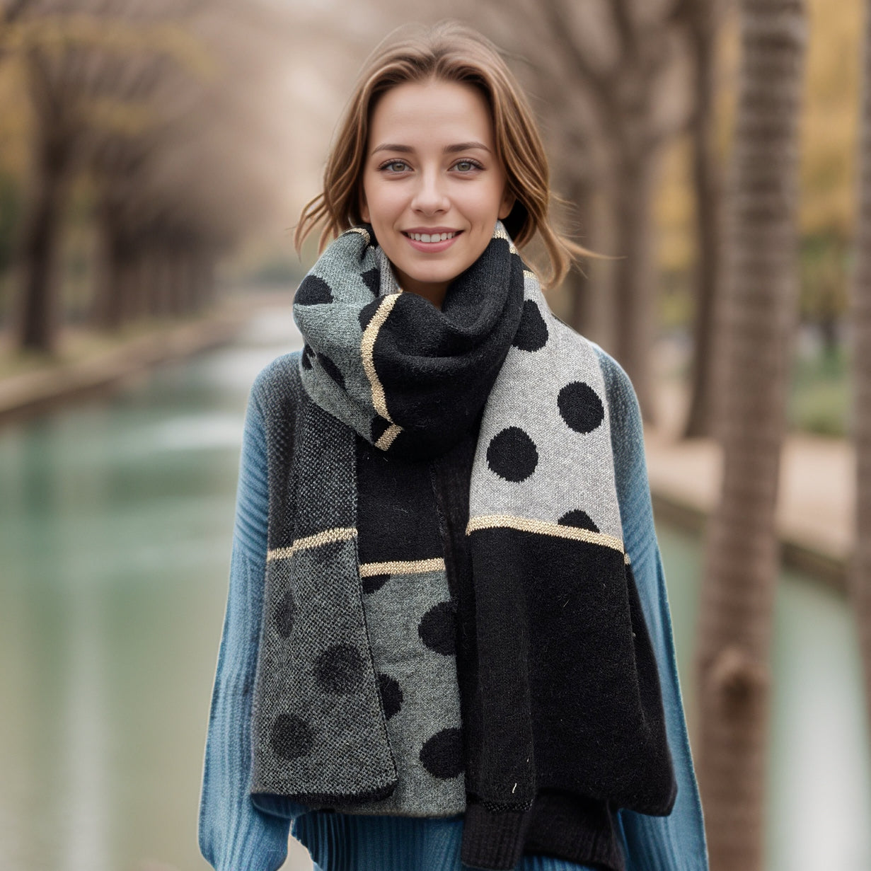 The Black Ginger Dasa Knitted Spotty Scarf in Grey is a soft, modern, and stylish accessory designed to keep you warm while adding a playful touch to your outfit. With its eye-catching spot pattern and versatile grey tones, it blends comfort, elegance, and practicality for everyday wear.