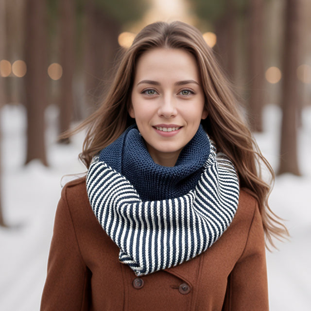 The Black Ginger Pandji Half & Half Double Snood in Navy is a perfect balance of practicality and style. Crafted from soft knitted fabric, it provides a luxurious feel that keeps you warm without the bulk. The half-and-half design combines a solid navy knit with a contrasting cream and navy striped section, giving it a contemporary, eye-catching appeal.