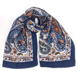 The Black Ginger Sawan Golden Paisley Scarf – Blue is a stylish and elegant accessory featuring a detailed paisley design in rich tones of blue, gold, and burnt orange. This lightweight printed scarf adds a touch of sophistication to any outfit, perfect for year-round wear.