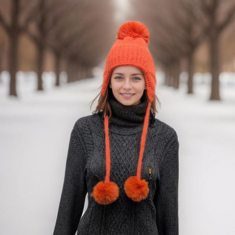 Black Ginger Long Tie Pom Pom Knitted Hat - Orange