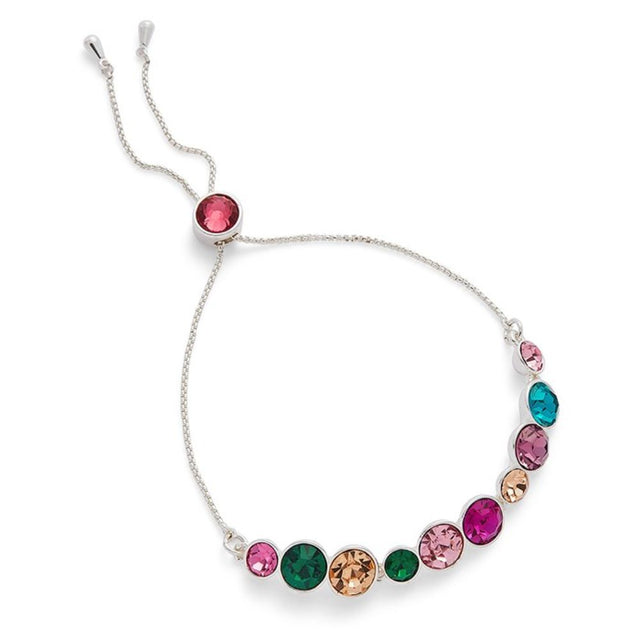 The Equilibrium Vibrant Glam Rox Friendship Bracelet – Silver combines expressive colour with elegant design, making it a standout accessory for any jewellery lover. Featuring a beautiful gradient of faceted stones in shades of pink, green, amber, and teal, the bracelet brings a lively burst of personality to your wrist. The adjustable slider fastening allows for a customised, secure fit, ensuring comfort throughout the day. Its polished silver-tone setting creates a sophisticated contrast to the vivid stones, making the bracelet suitable for both casual wear and more dressed-up occasions. Ideal as a meaningful friendship gift or a personal style statement, this piece delivers both charm and contemporary glamour.