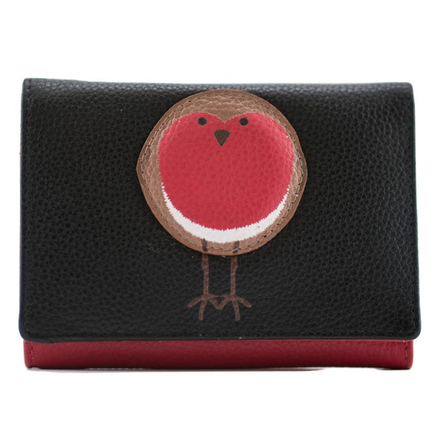 Mala Leather Bobbie Robin Tri-Fold Purse – Black and Red Leather with Robin Applique