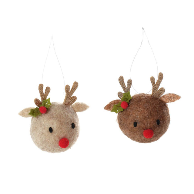 Add a touch of rustic festive charm with this delightful pair of fabric reindeer hangers from Richard Lang. Crafted from soft materials with thoughtful details, each reindeer features a sparkling pair of glitter antlers, holly accents, and a bright red nose for a fun, Christmassy finish. The set includes two colour variations — one light brown and one dark brown — offering a lovely contrast when displayed together. Measuring approximately 10cm, they make a wonderful addition to your Christmas decorations and are ideal for creating a warm, family-friendly atmosphere.