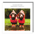 The Tracks Publishing Penblwydd Priodas Hapus Dachshunds Card is a charming Welsh anniversary card featuring two adorable dachshunds dressed in matching raincoats. Perfect for celebrating a wedding anniversary, it combines cuteness, quality, and a heartfelt Welsh message to make any couple smile.
