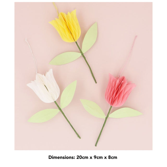 - A beautiful set of 3 honeycomb paper tulip hanging decorations