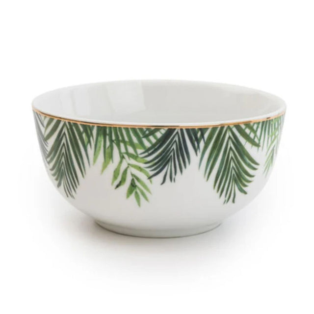This Candlelight Home Eden Decal Rice Bowl combines elegant design with practical versatility. The exterior features a lush emerald green palm leaf pattern that instantly brings a sense of nature to your table setting. The gold rim adds a glamorous accent, making the bowl suitable for both everyday dining and more formal occasions.