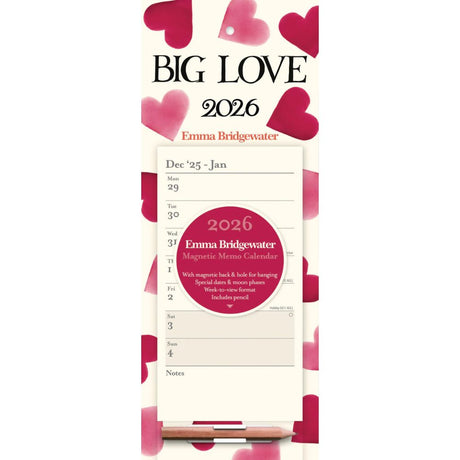 £1099Unit price /UnavailableVery low stock (2 units)Otter House Emma Bridgewater Big Pink Hearts WTV Magnetic Calendar 2026