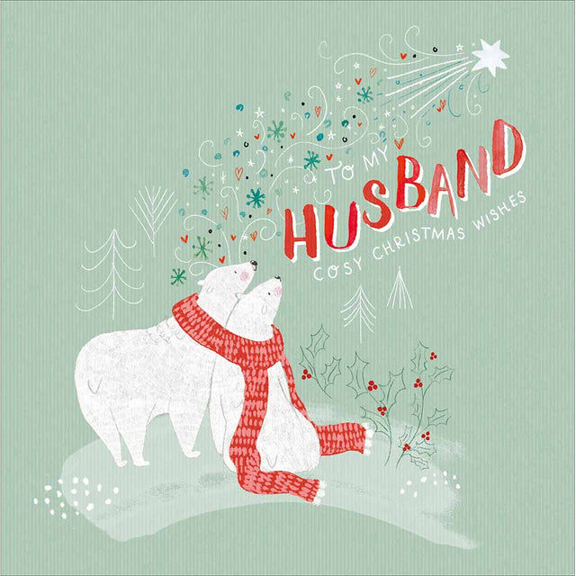 Send heartfelt festive wishes with the Woodmansterne Husband – Cosy Polar Bears Christmas Card. Featuring two adorable polar bears wrapped together in a cosy red scarf beneath a starry winter sky, this charming card is the perfect way to show love and affection to your husband at Christmas.