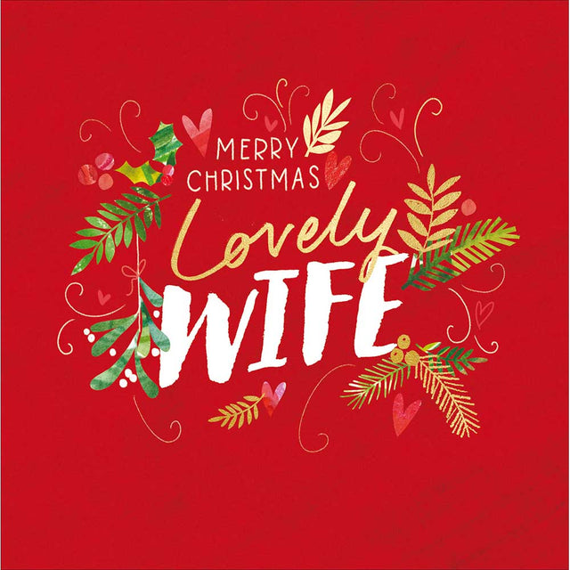 The Woodmansterne Lovely Wife – Text with Leaves Christmas Card is a stunningly festive way to share your heartfelt message. Set against a rich red background, the design features the words “Merry Christmas Lovely Wife” in elegant white and gold script, surrounded by green foliage and festive accents. The hand-painted effect and fine detailing add a touch of sophistication while keeping a warm, personal tone.