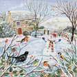 Charming Winter Design – Depicts a cheerful snowman surrounded by robins, blackbirds, and other garden birds in a snowy village setting.