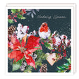 Elegant festive design – features a beautifully painted robin perched among poinsettias, holly, and pinecones.