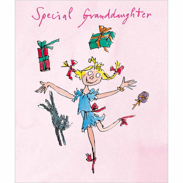 Delight your granddaughter this festive season with the Woodmansterne Granddaughter – Girl Juggling Presents Christmas Card. Featuring a cheerful illustration of a girl juggling gifts, this fun and festive card is perfect for sending warm Christmas wishes with love and joy.
