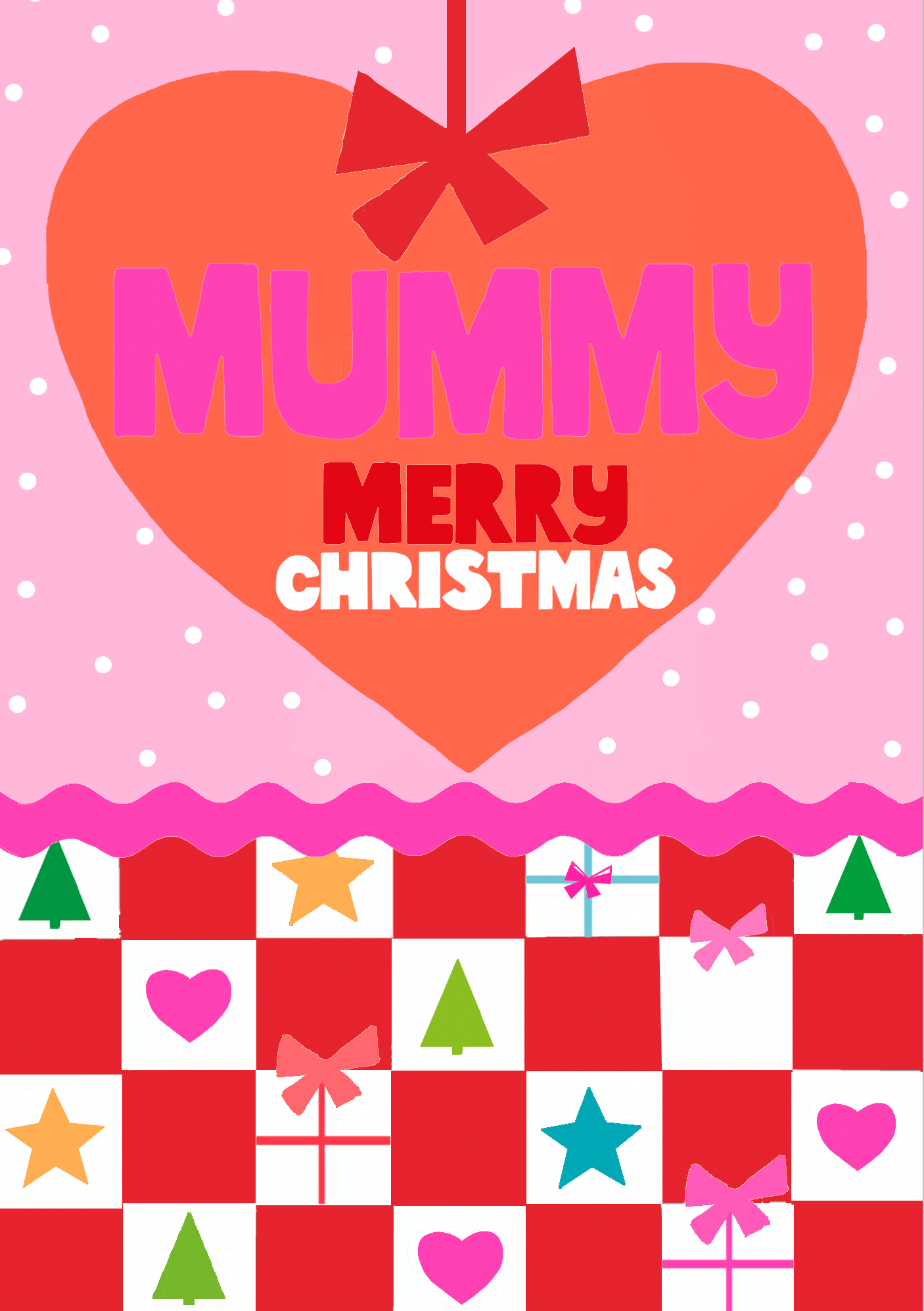 Vibrant Festive Design – Features a large orange heart with the words “Mummy Merry Christmas” in playful, bold lettering.