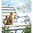 Charming seasonal artwork – cat and birds in a snow-covered garden scene.