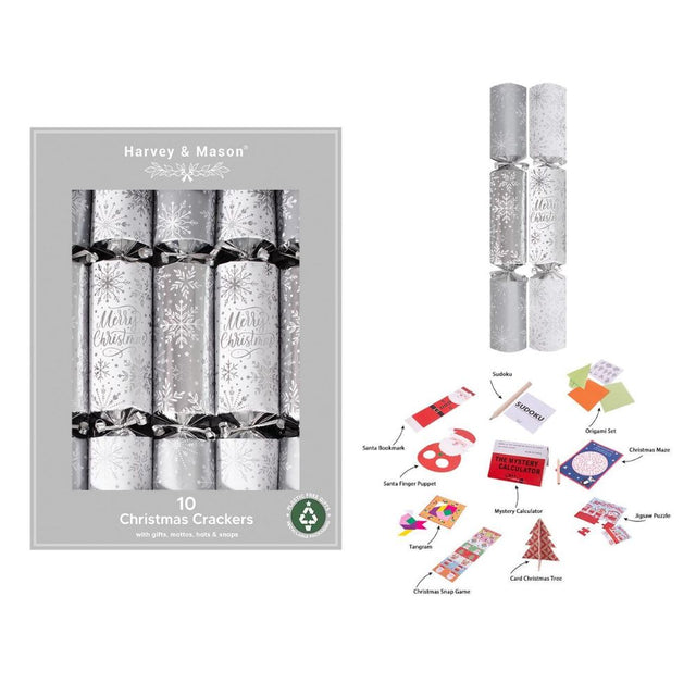 The Harvey & Mason Silver Snowflake Crackers bring festive charm and fun to your Christmas table setting. Each cracker showcases either a striking silver snowflake motif on a silver base or a white base with snowflakes and “Merry Christmas” text, all beautifully finished with silver curling ribbon.Inside, guests will find the traditional snap, hat, and motto, along with a wide variety of fun prizes including puzzles, games, or festive trinkets. Perfect for entertaining family and friends, these crackers combine elegance with excitement, ensuring your Christmas gathering is filled with joy.As part of Harvey & Mason’s commitment to sustainability, both the crackers and packaging are fully recyclable, with plastic-free contents to make your celebrations more eco-friendly.Specifications