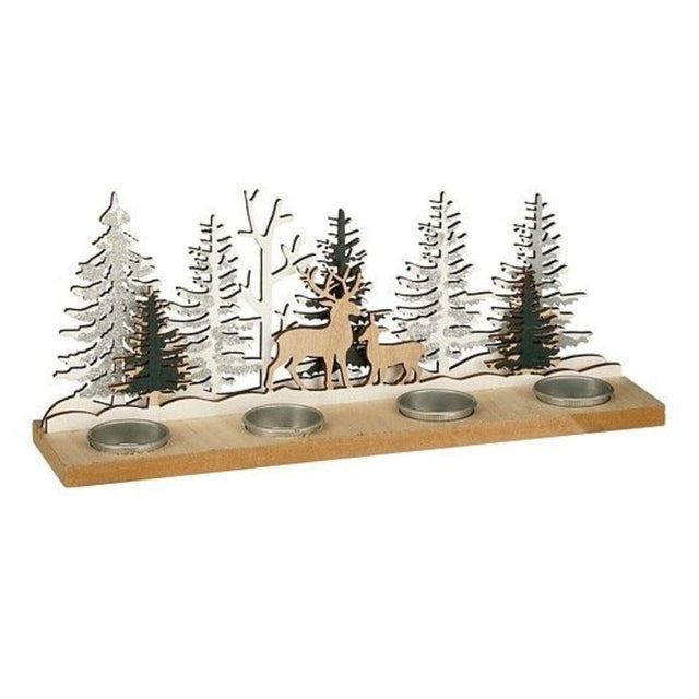 Enhance your seasonal décor with the Mica Decorations 35cm Wood Winter Scene Candle Holder. Expertly crafted from natural wood, this enchanting candle display features layered silhouettes of fir trees and woodland deer, delicately accented with shimmering finishes to mimic a snowy forest. Designed to hold four tealights, it casts a warm, inviting light that highlights the intricate details of the winter landscape. Whether used as a Christmas table centrepiece, placed on a mantel, or added to a festive display, this candle holder brings a sophisticated yet rustic charm to any setting. A perfect addition for those who love cosy winter interiors or nature-inspired holiday decorations.