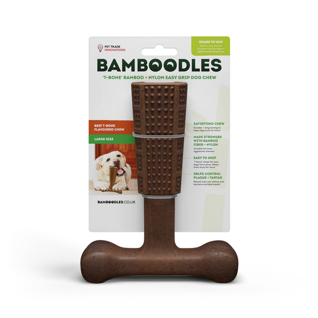 Meet the Bamboodles 'T-Bone' — the ultimate chew toy designed for durability and satisfaction. Combining the natural strength of bamboo fibre with robust nylon, this chew toy is built to withstand even the most aggressive chewers. Its unique 'T-Bone' shape allows your dog to comfortably hold and stabilize the toy with their paws, making chewing sessions more enjoyable and effective. Perfect for keeping dogs busy and promoting dental health, the Bamboodles 'T-Bone' is a must-have for any dog owner.