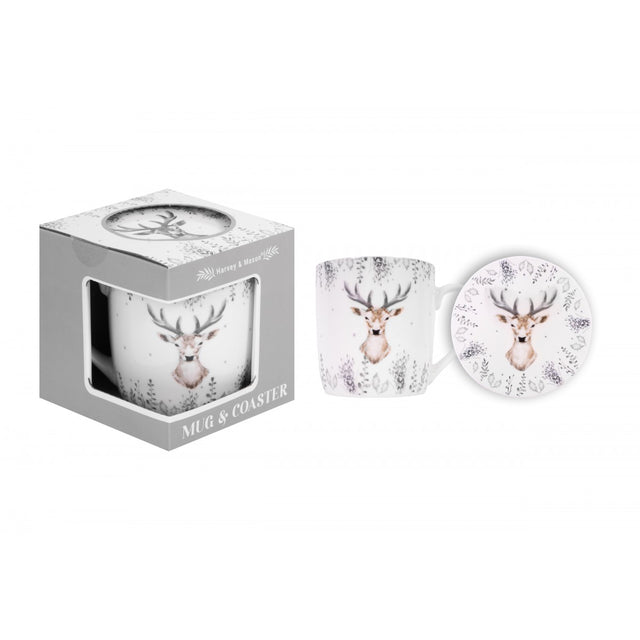 Harvey & Mason Silver Deer Christmas Mug & Coaster Set – Festive New Bone China Gift