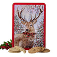 Features a beautifully embossed tin with a majestic Highland stag, tartan bow, snowy woodland scene, red berries, and evergreens.