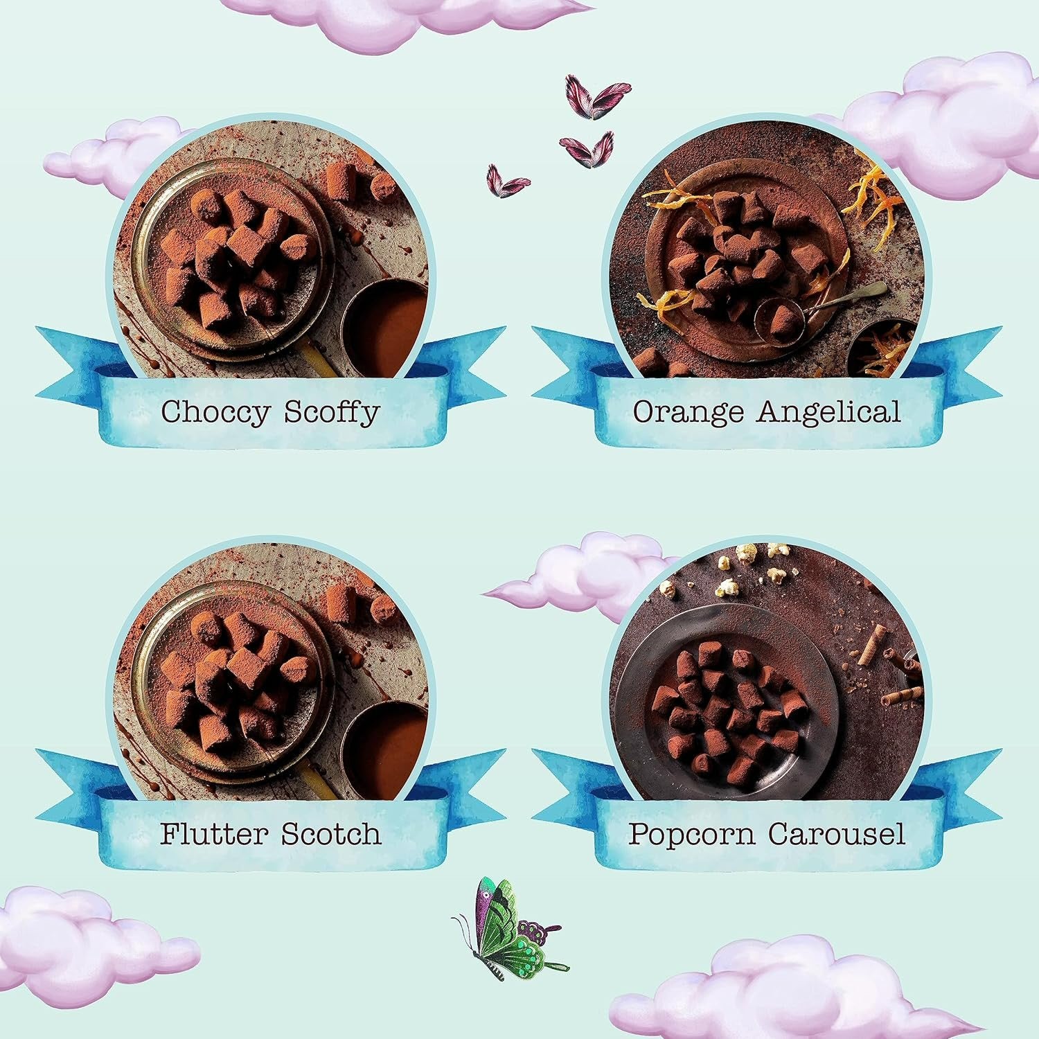• Delectable Assortment: Includes four exquisite truffle flavours — Choccy Scoffy (pure chocolate indulgence), Flutter Scotch (buttery caramel with a hint of sea salt), Orange Angelical (a zesty chocolate delight), and Popcorn Carousel (creamy and buttery with a playful crunch).