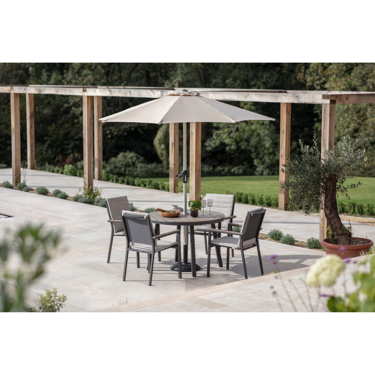 Ideal for small scale entertaining, the round tabletop has tree-free slats giving the appearance of real wood with the benefit of a lightweight, low-maintenance material. The four dining chairs also feature tree-free arm rests and are stackable for easy storage. Removeable chair cushions in Fawn Linen add an extra layer of comfort and are made from our season-proof Eco fabric using recycled plastic bottles. Aluminium table and chair frames, in a smart Anthracite shade, make this set lightweight and easy to maintain. A parasol and base in a complementary Sand colour completes the set.