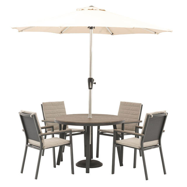 Bramblecrest 110cm Fawn Zurich 4 Seat Round Dining Set with Parasol & Base - X25ZR01