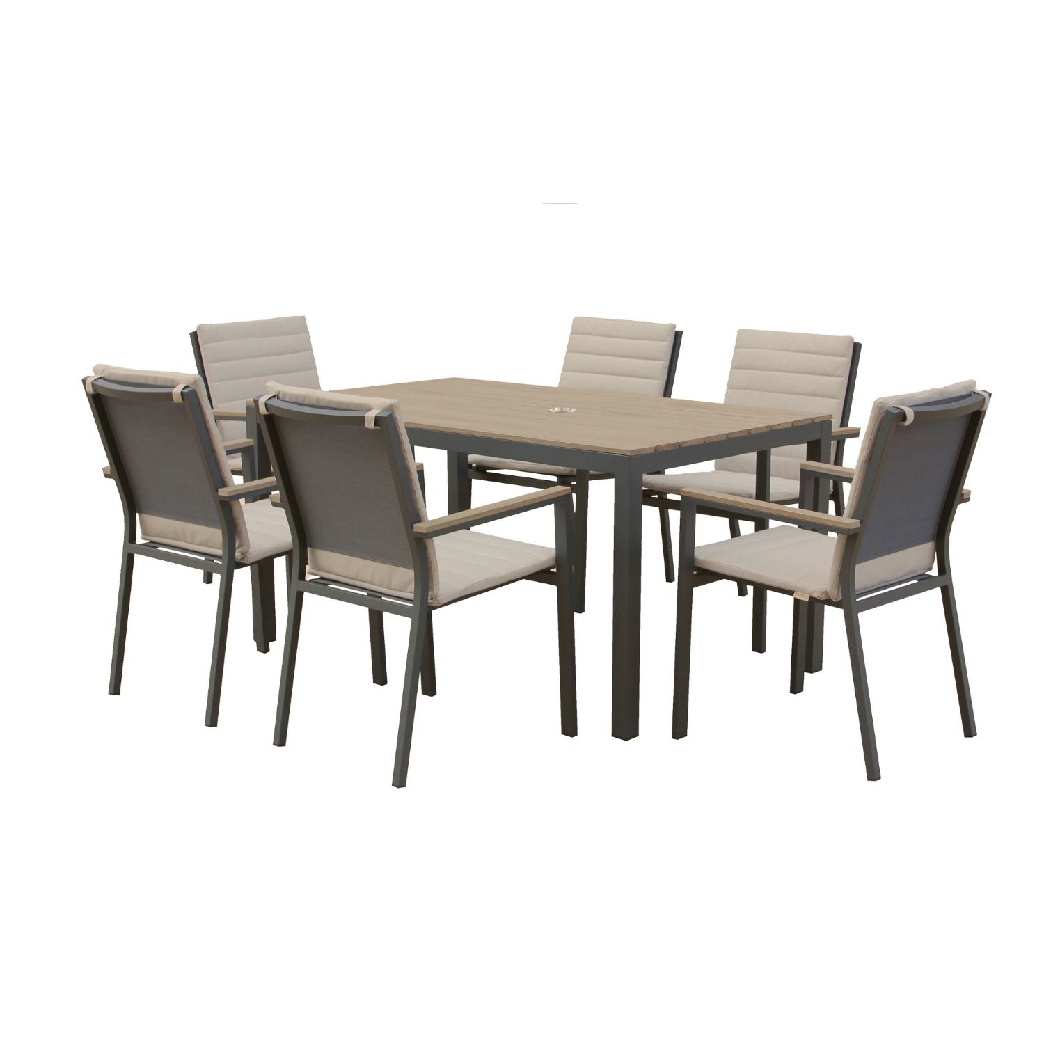 Featuring a spacious rectangular dining table with a slatted tree-free ‘wood effect’ tabletop that won’t rot and six stackable powder-coated aluminium dining chairs. This modern looking set includes a crank parasol with a round 3m canopy in Sand. The metal garden chairs are crafted to a high standard and include tree-free armrests for enhanced comfort, protecting bare arms in the summer from cool metal.