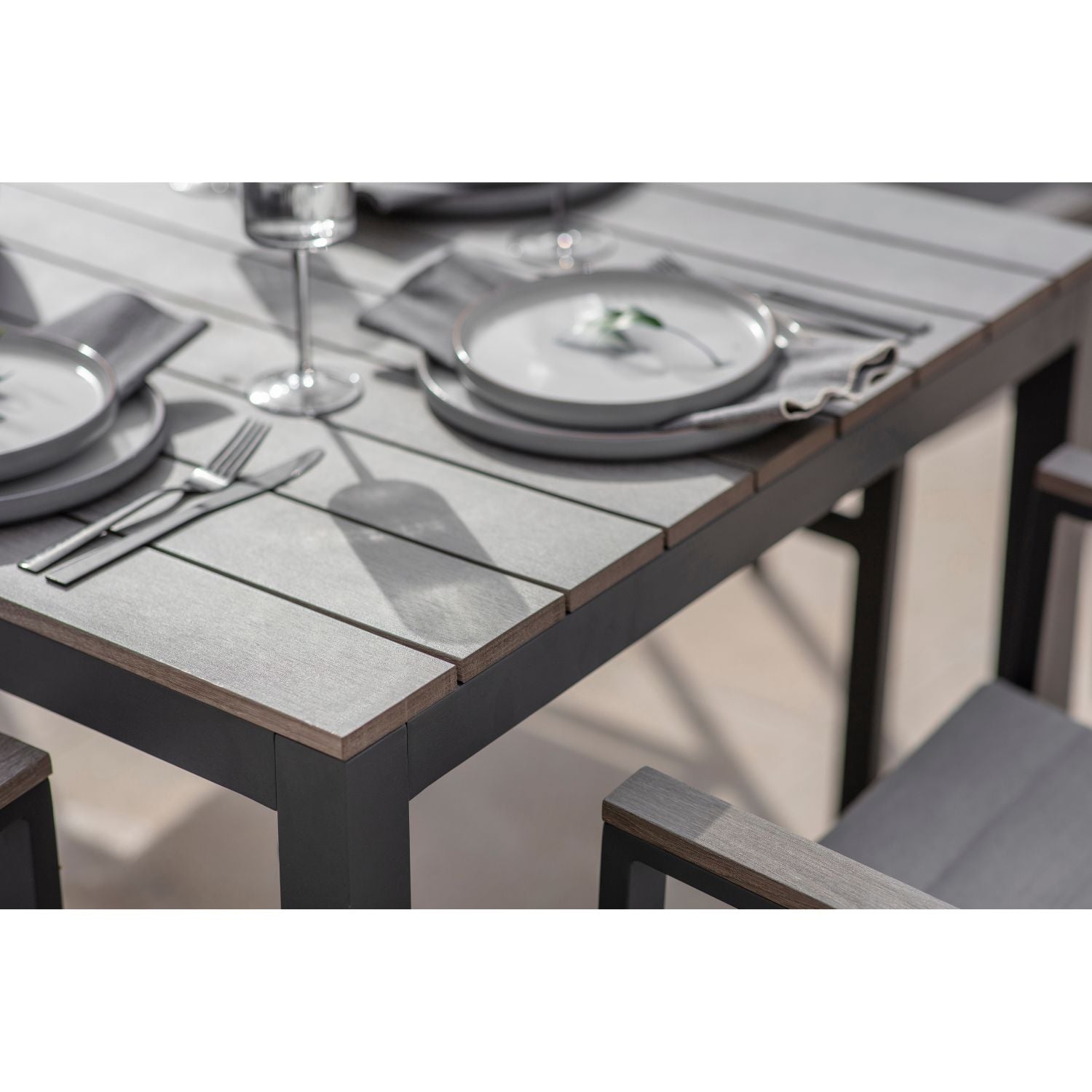 To enhance comfort further, each dining chair includes a padded seat and back cushion made with a season-proof fabric in Eco Fawn Linen. The slimline cushions are designed with a modern line pattern which ties in nicely with the lines of the slatted tabletop and come as one, folding in half for easy storage. You can also tie them to the seat so they won’t blow away. These eco cushions are made from recycled plastic bottles and being season-proof means they can be left outside during light summer showers because they are backed with a waterproof liner to restrict water ingress. Storing dry cushions overnight in a cushion box or inside will keep them fresh, clean and ready to use. Storing cushions during winter and autumn months is essential to protect them from grime.