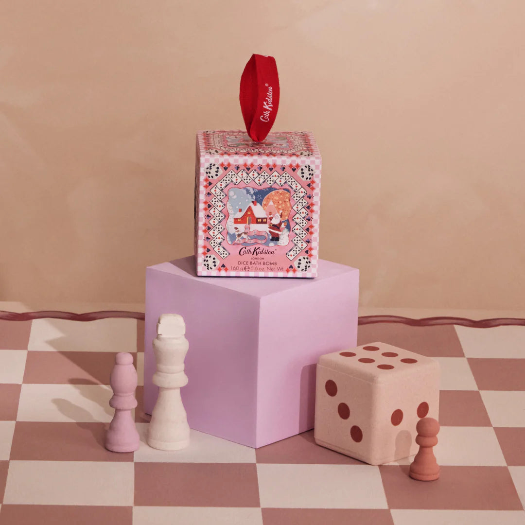 Festive design: Playful dice-shaped bath bomb in a charming Cath Kidston-themed gift box.