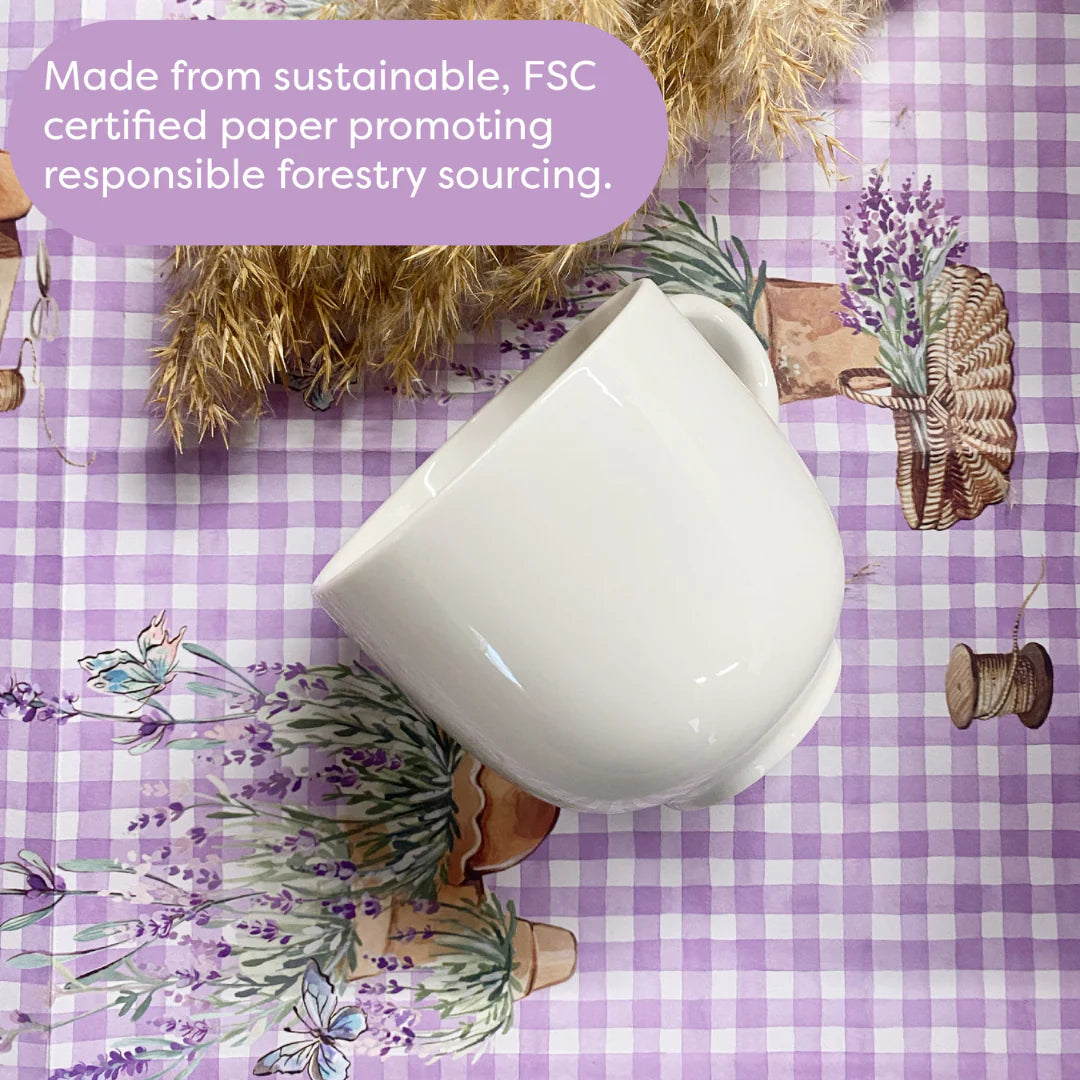 • Featuring a hand-painted illustration of lavender-filled terracotta pots and baskets resting on a charming English gingham check, these liners add a touch of classic beauty to your home.