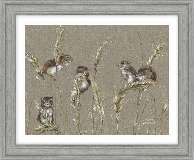 Introduce a touch of charm into your home with the 'Harvest Assembly' Framed Print by Nicola Janes Rowles. Featuring five adorable door mice perched on wheat stems in a sleek grey frame, this print is the perfect addition to any space. Bring a piece of nature into your living space with this delightful and unique piece.