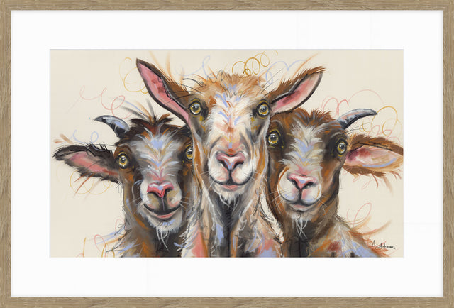 This expertly crafted 'Silly Billys' framed print by Ashley Saunders showcases three charming Billy goats in a stunning natural frame. Delight in the intricate details and vibrant colours, adding a touch of rustic charm to any space.