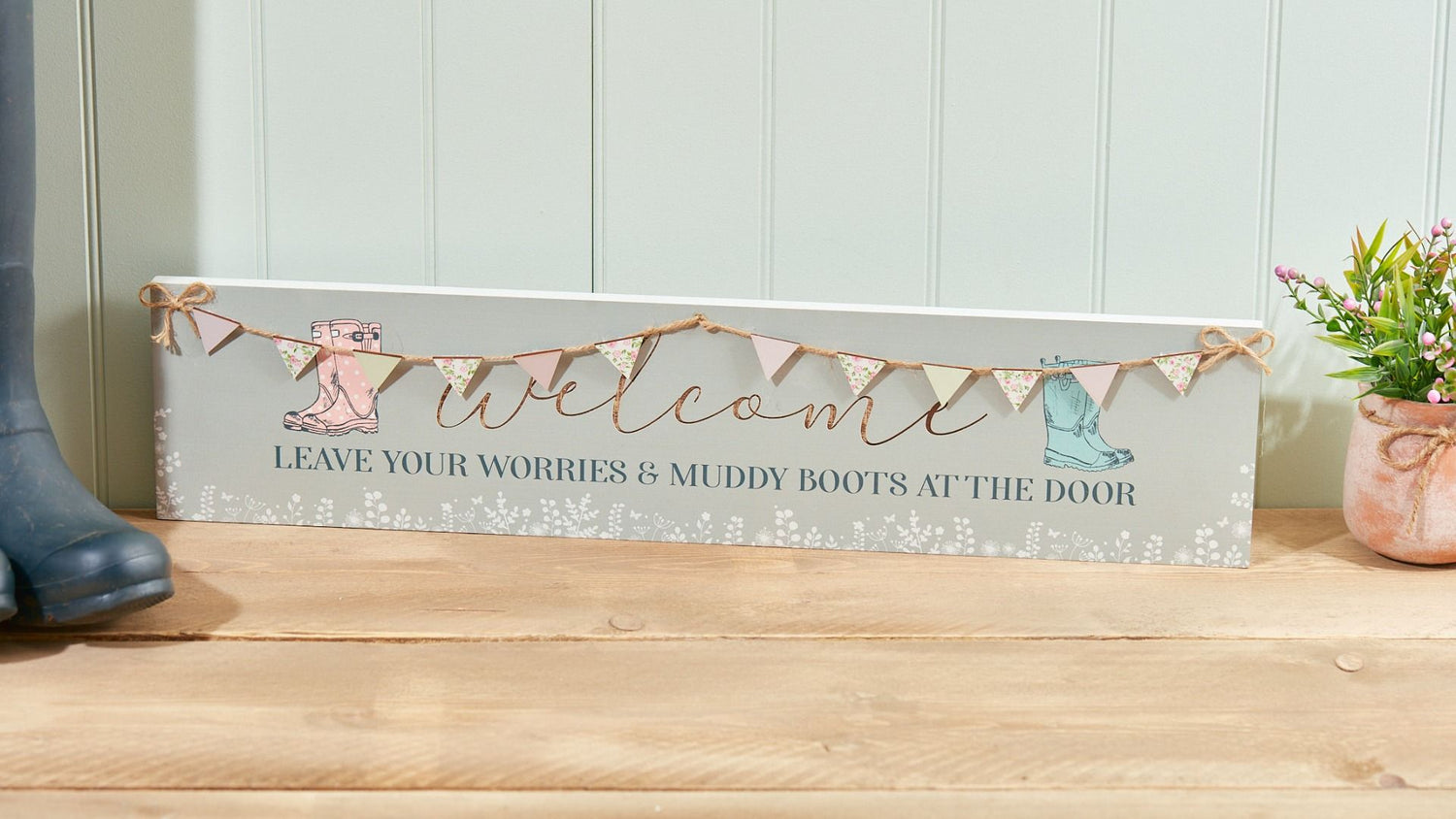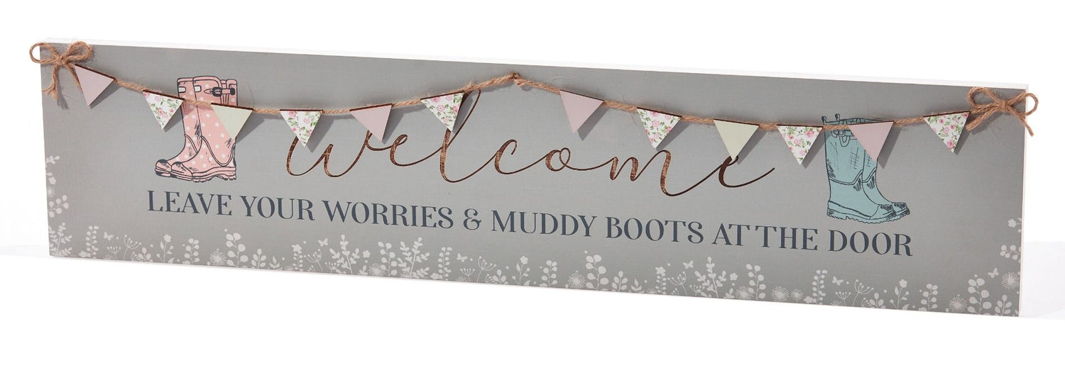 Welcome your guests with a touch of warmth and charm with the Richard Langs Welly Boot with 3D Bunting Wooden Plaque. Crafted with a welcoming phrase, this plaque is perfect for any home, reminding visitors to leave their worries and muddy boots at the door. Add a homely touch to your space today.