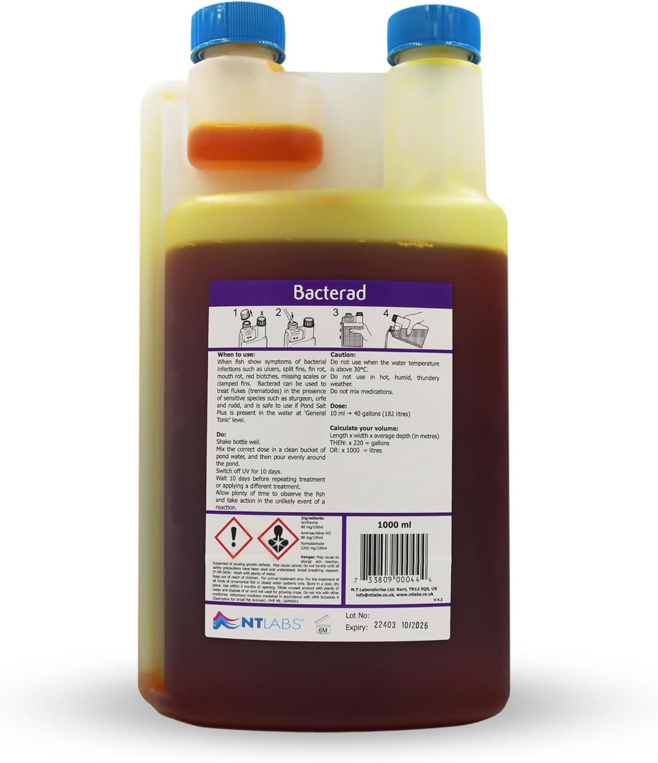 The NT Labs Bacterad 500ml Pond Anti-Bacterial Fish Treatment is a highly effective solution designed to treat bacterial infections and external parasites in pond fish. This product is formulated to address common issues such as ulcers, fin rot, and flukes, ensuring the health and well-being of your aquatic life.