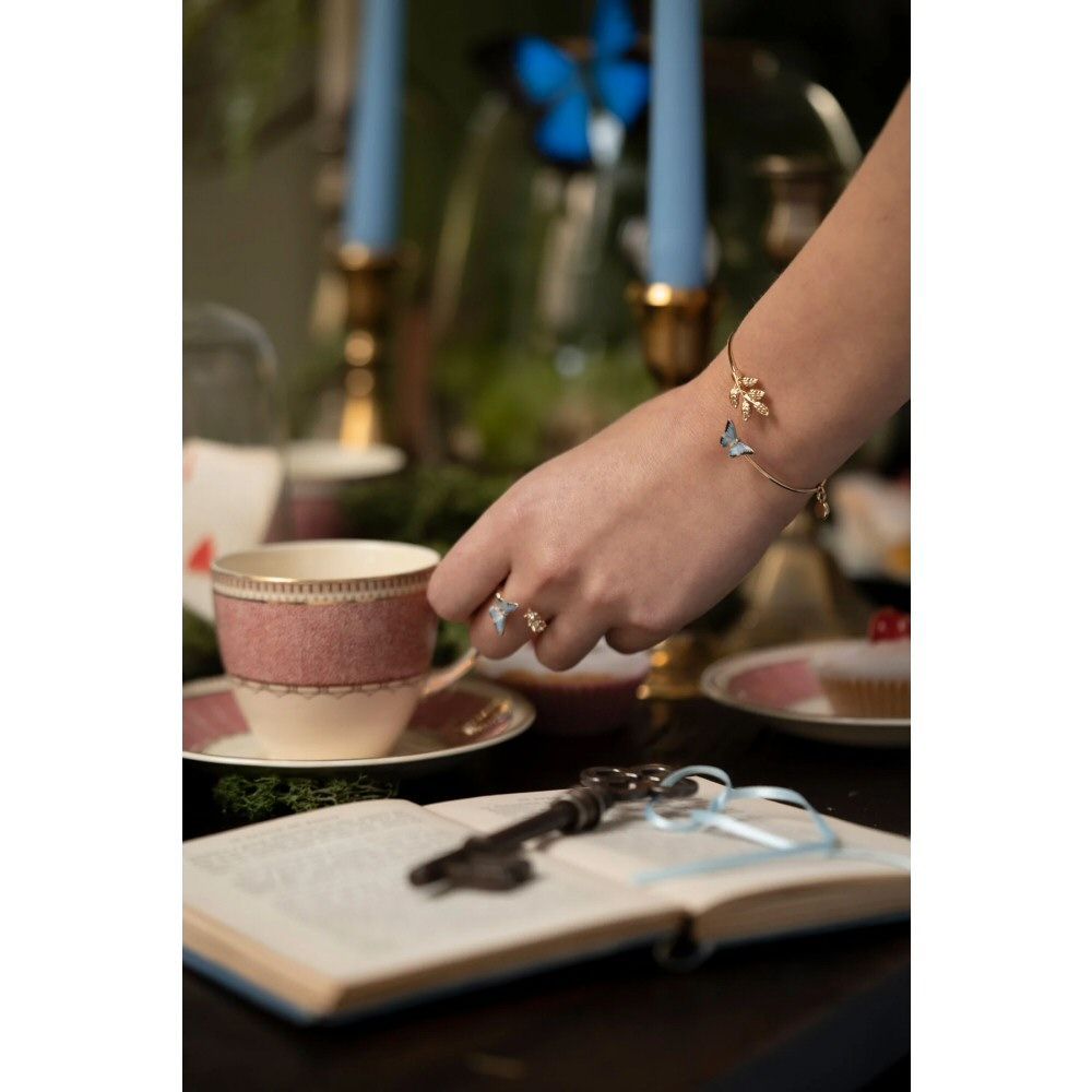 Gorgeous blue butterfly charm alongside a gold leaf charm, this bangle, made from durable brass, can be squeezed open and closed to suit the wrist of any wearer! iInspired by a Wonderland theme and Victorian curiosities, this delicately hand-painted enamel butterfly charm represents the freedom of nature and new beginnings.
