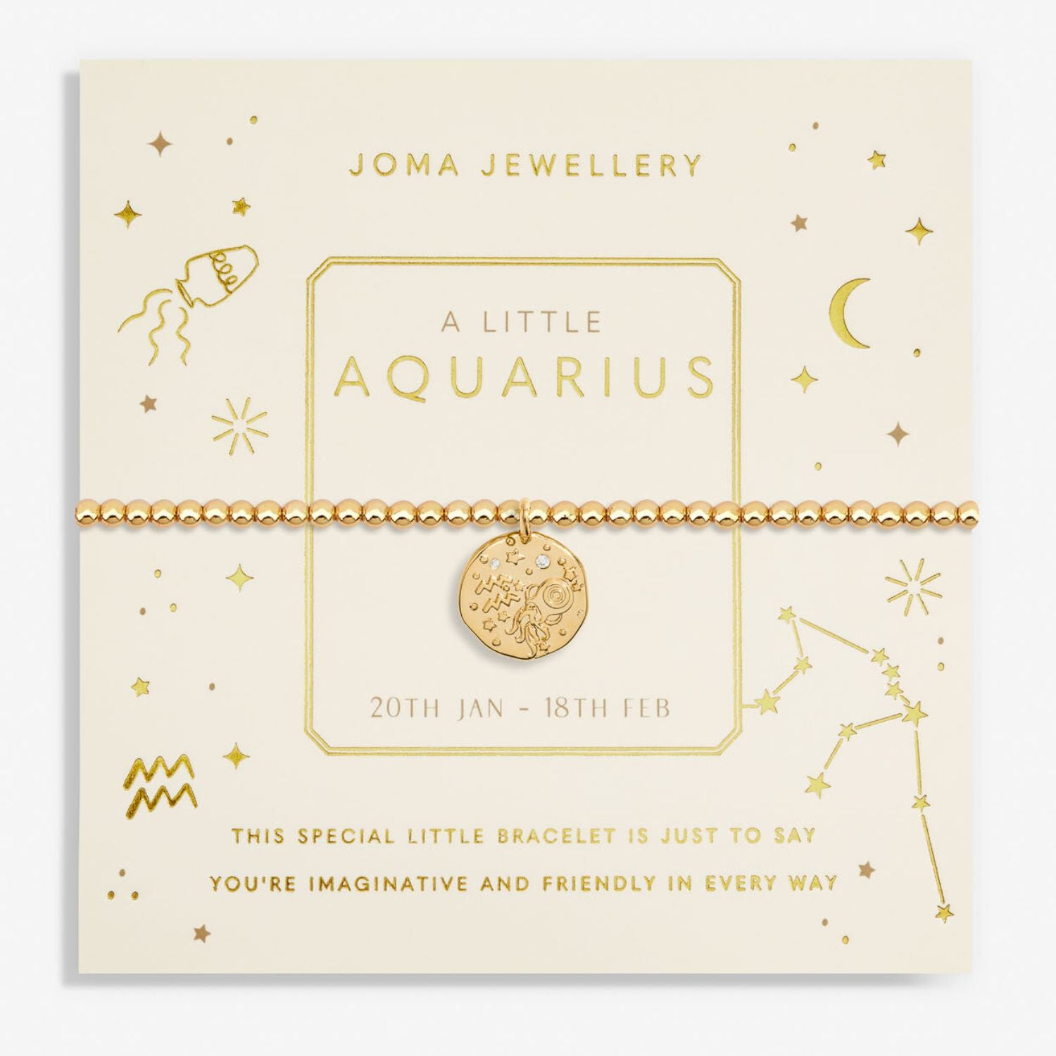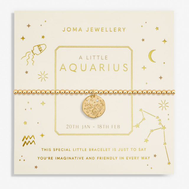 Celebrate the uniqueness of an Aquarius with the Joma Jewellery Gold Star Sign A Little 'Aquarius' Bracelet. With its gold-plated beads and a sparkling cubic zirconia star sign charm, this bracelet is a perfect gift to add a touch of zodiac charm to any wrist. Whether it's a birthday, or just to celebrate someone special, this beautiful bracelet will remind them of their imaginative and friendly nature. Presented on a zodiac-printed card, it’s a meaningful way to show your love.