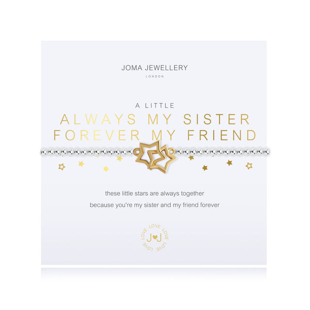 "These little stars are always together because you're my sister and my friend forever” Sisters are built-in best friends, which we think is cause to celebrate! This gorgeous A Little ‘Always My Sister Forever My Friend’ Bracelet is as sweet as it is sentimental, with its interlinked gold-plated star-shaped charms that represent the bond sisters share, which sit pretty on a silver-plated stretch bracelet, designed to fit every wrist!