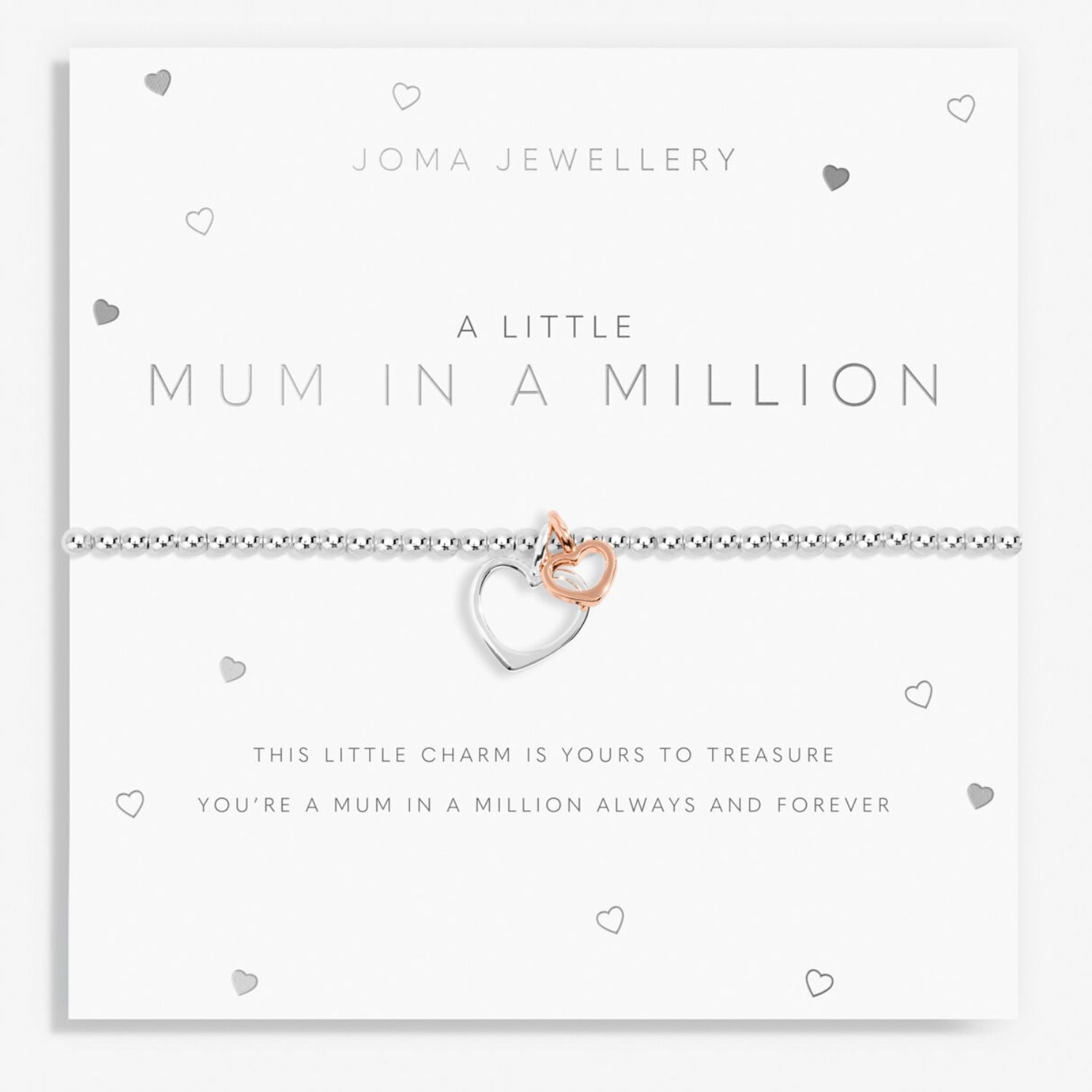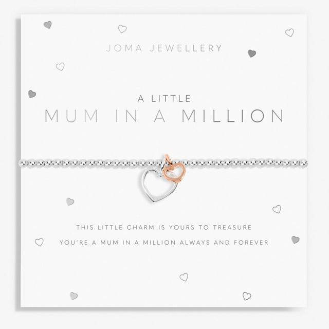 A Little 'Mum In A Million' Bracelet features a silver-plated design that will dazzle with every movement. Featuring a stretch-bead style and a sparkling silver-plated heart charm, wrapped around one of the stylised cards and framed by a sweet poem. The perfect every day gift, and mother’s day gift!