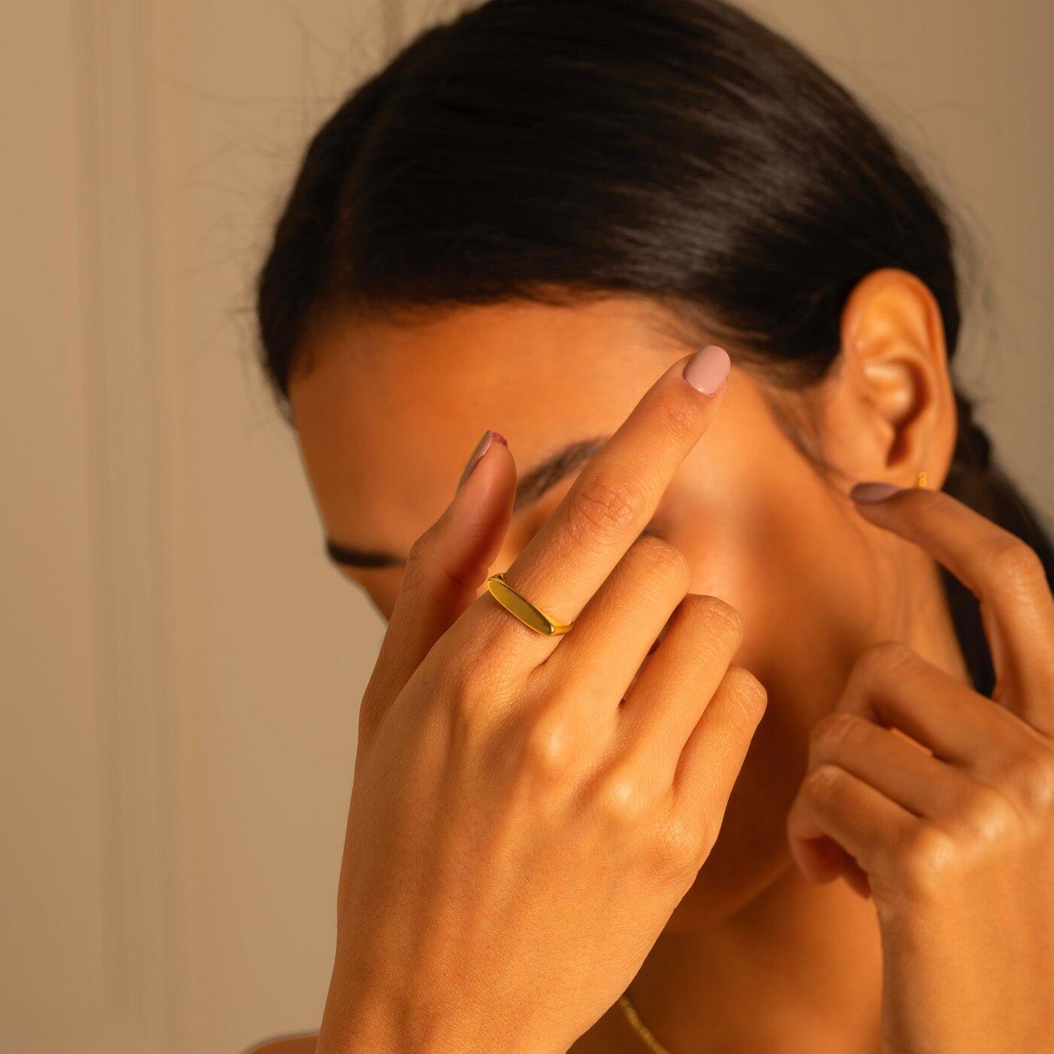 Update your ring stack with ease with our timeless Signet Waterproof Gold Ring. This gorgeous golden style is coated in 18K Gold PVD, which makes it completely waterproof, sweat proof and life proof, so you can wear it day in, day out. Minimal in design but big on style, this classic ring is available in three different sizes to cater to all that wish to wear it! This style comes with a reusable suedette jewellery pouch and one of our Free Gift Bags.