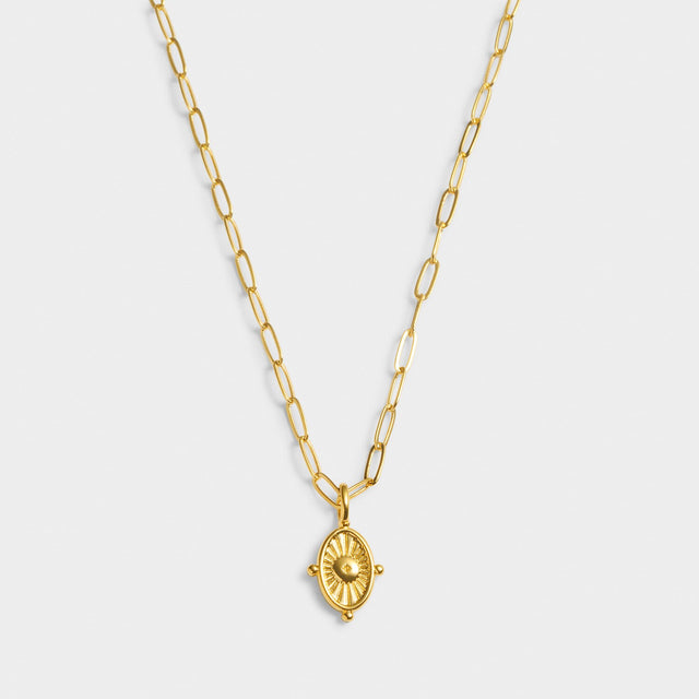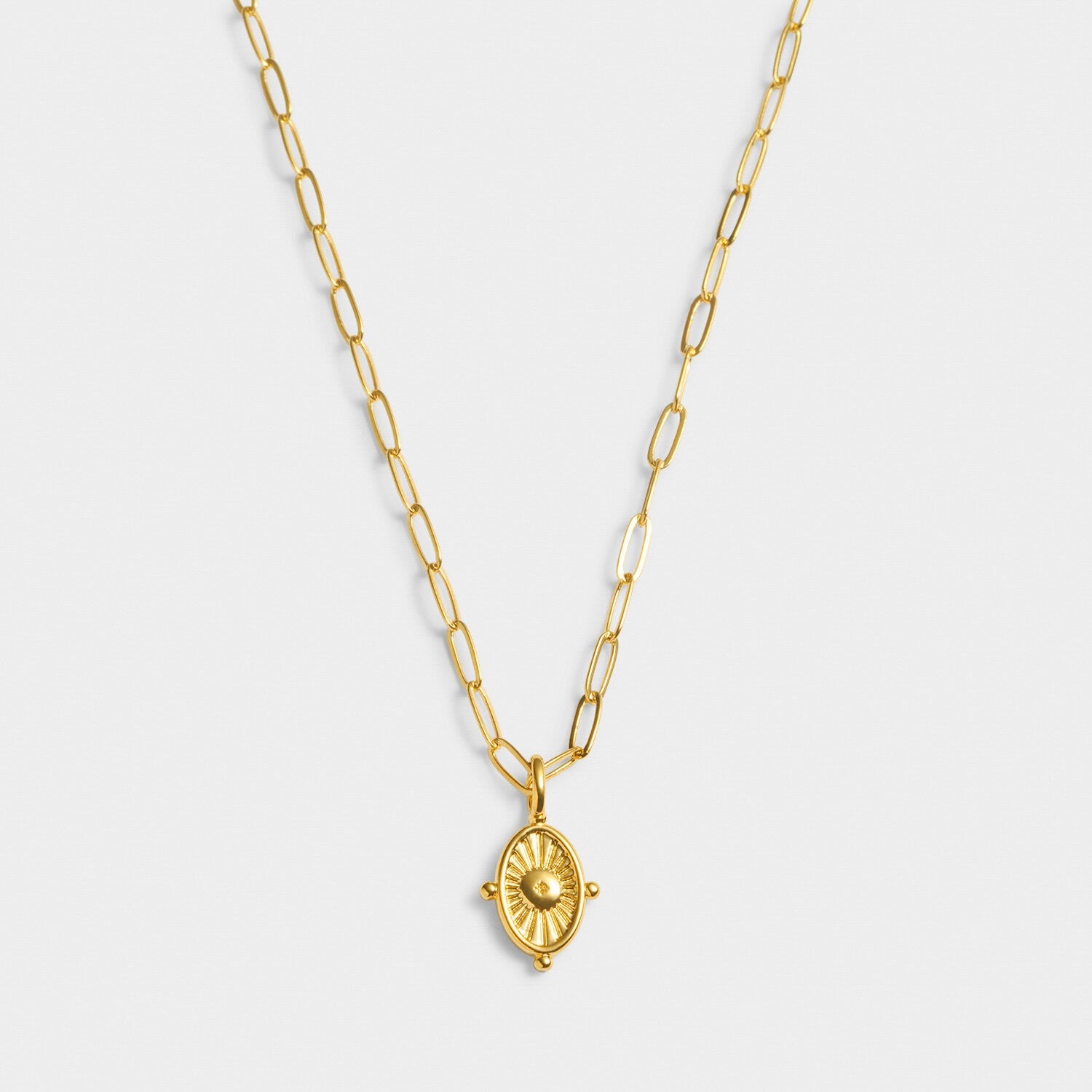 Add some interest to every look with our Talis Waterproof Gold Charm Necklace. Thoughtfully designed in 18K Gold PVD Coating, this necklace is not only super stylish, but it's waterproof, sweat proof and life proof! This style features a link chain that holds a delicate golden talisman pendant - on-trend while still be timeless. Wear this style individually or layered with our other necklaces. This style comes with a reusable suedette jewellery pouch and one of our Free Gift Bags.