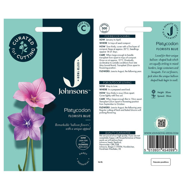 Add a touch of charm to your garden with Johnsons Platycodon Florists Blue Seeds, commonly known as Balloon Flower. This delightful perennial produces stunning star-shaped blue flowers that emerge from balloon-like buds, creating an enchanting display in your garden. With its unique appearance and long flowering season, Platycodon is perfect for borders, rock gardens, and as a cut flower, attracting pollinators and adding interest to your outdoor space.