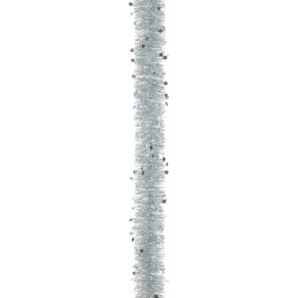 • 2m long luxury tinsel garland with die-cut silver stars