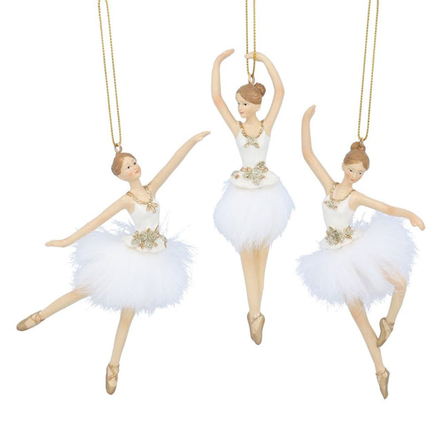 The Gisela Graham Ballerina Feather Skirts Hanging Decorations combine timeless elegance with festive sparkle. Each ballerina figurine is exquisitely crafted from resin and features a flowing white feather tutu, golden ballet slippers, and delicate floral detailing on the bodice. The soft textures and refined finish capture the grace and poise of a true ballerina, making these decorations a standout feature on any Christmas tree, wreath, or garland.
