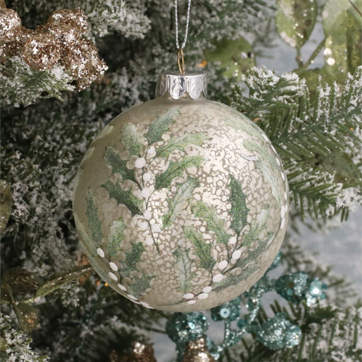 Gisela Graham Antique White & Silver Holly Glass Bauble – Elegant Winter Decoration
