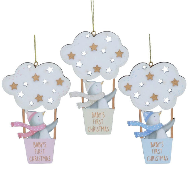 Celebrate a little one’s first festive season with the Gisela Graham Baby's First Christmas Penguin in Cloud Decoration. Available in three sweet designs, each features an adorable penguin floating in a cloud-shaped balloon basket, making it a delightful keepsake for this special milestone.