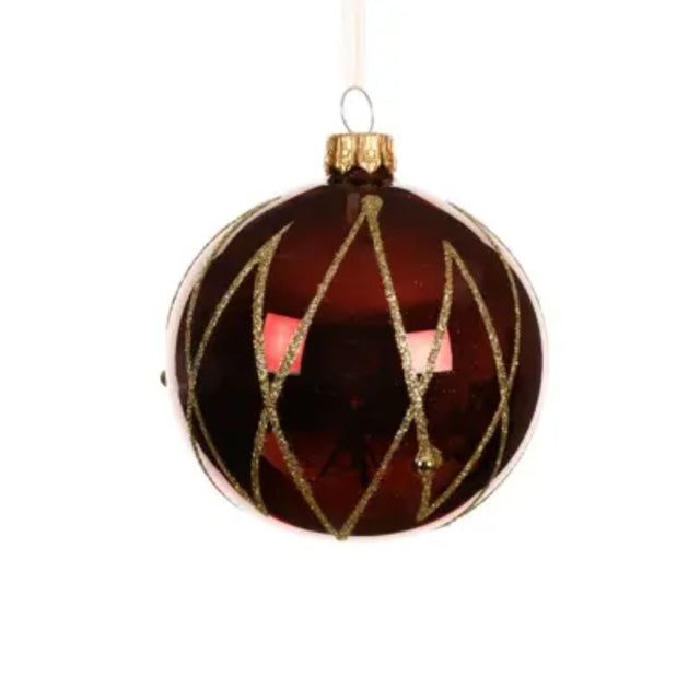 Decoris 8cm Oxblood Shiny Glass Bauble with Gold Vertical Cross Lines