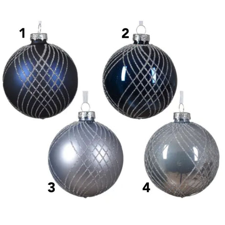 £499Unit price /UnavailableIn stockDecoris 8cm Blue/Silver Shiny/matte Baubles with Silver Glitter Line Design (Choice of 4)