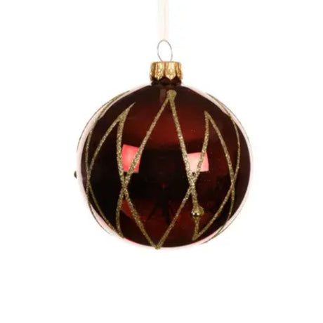 £299Unit price /UnavailableVery low stock (2 units)Decoris 8cm Oxblood Shiny Glass Bauble with Gold Vertical Cross Lines