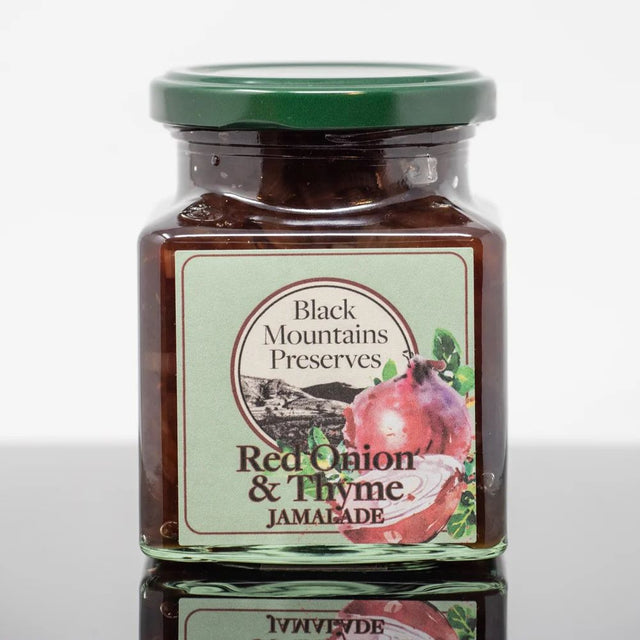 Black Mountain Preserves 280g Red Onion & Thyme Jamalade is a versatile and flavour-packed preserve that brings the sweet, rich taste of red onions together with the fresh, herbal essence of thyme. The addition of malt vinegar provides a subtle tang, while peppercorns and bay leaves add depth and complexity, making this jam a perfect accompaniment to a wide range of dishes.