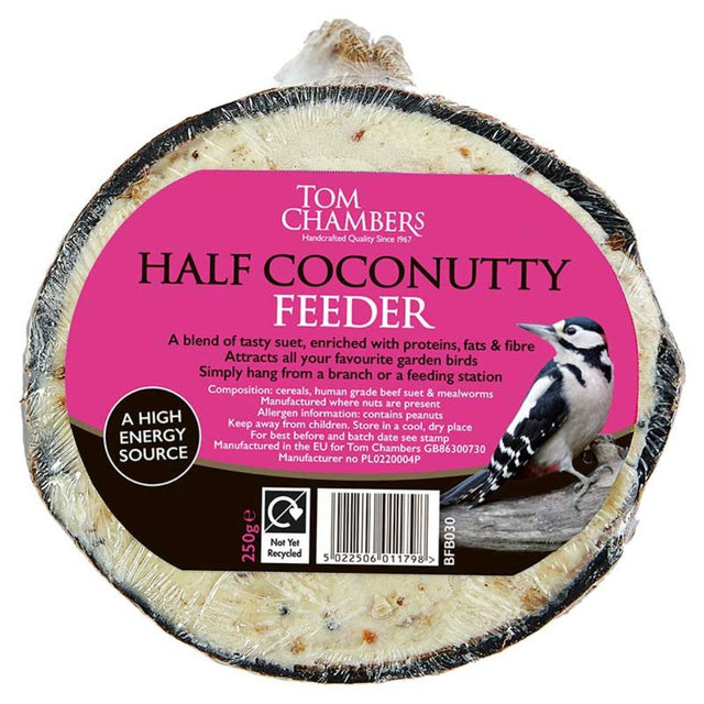 The Tom Chambers Half Coconutty Feeder is a simple, sustainable, and effective way to attract wild birds to your garden. Each half coconut shell is hand-filled with a nutritious blend of human-grade beef suet, cereals, and seeds, providing a rich source of fat and protein that supports energy, body warmth, and feather health.